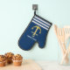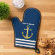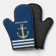 Esta imagen muestra un nombre de barco y un ancla sobre un fondo de rayas azul marino y blanco.