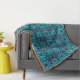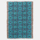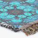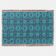 Un patrón simétrico y caleidoscópico presenta tonos vivos de azul con acentos de contorno rojo y oscuro. El diseño intrincado forma un motivo de repetición, creando un efecto visual fascinante.