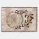 Un diseño de atrapasueños con adornos dorados y marrones que incluye un círculo de bambú redondo con una red de vida con plumas de tonos marrones y cuentas rojas sobre un fondo de plumas suaves.