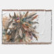 A boho-style horse adorned with a feathered headdress, featuring pastel, muted colors and feathers woven throughout its mane, inspired by Native American style.