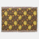 Un patrón festivo de calabazas doradas, hojas y corazones naranjas, y bayas caen sobre un fondo marrón.