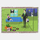 Este edificio retro de Personalizado urbano incluye el dibujo personalizado de un apartamento de estilo penthouse con una decoración elegante y vistas a un horizonte urbano. El apartamento cuenta con un suelo verde y una pared de ladrillo verde. En la pared hay cuatro pinturas de tela estiradas clásicas de la película Martini, también disponibles en la tienda Zazzle de StrangeLittleOnion (¡insinuación!). Tres de las impresiones tienen un fondo turquesa y una está sobre un fondo negro. Debajo de las estampas de lona, hay un sofá moderno azul de mediados de siglo. En el sofá hay una bonita y sofisticada belleza de pelo cuervo. Ella lleva un vestido clásico, pequeño, negro con un corpiño rosado caliente. En el lado opuesto de la habitación hay un hombre agradable, alto, oscuro y guapo. Lleva traje negro, camisa blanca y corbata verde. De un lado, él está sosteniendo un álbum de discos de vinilo y, de otro lado, está sosteniendo una portada de un álbum divertido. En el suelo, un otomano naranja sostiene un récord de jugador verde y negro. La portada de otro álbum, apuntada contra el otomano, tiene un disco que sale de un costado. También hay tres álbumes de vinilo coloridos diseminados por el suelo. Detrás del hombre, podemos ver a través de las puertas correderas de cristal un balcón verde. Un gato blanco vestido con un collar rosado está encaramado en el borde del balcón. Más allá del gato, hay un impresionante horizonte urbano con rascacielos y una luna creciente amarilla. Si así es como vive la otra mitad, ¡inscríbeme!