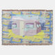 Camper rosa lindo en el dibujo de arte digital de la playa para los amantes de la vida viajera. Color de fondo personalizado.