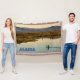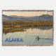 Solo en el desierto. En el interior de Alaska hay una canoa que cubre el agua de un lago que permanece en el espejo. A lo lejos, la típica taiga y las montañas. También aparece el texto "Alaska". Esta imagen se deriva de una fotografía del Servicio de Pesca y Vida Silvestre de los Estados Unidos.
