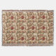 Una manta muy bonito con adorables muñecas vintage, gatitos, cintas rojas, bastones, paquetes de navidades, ramas de pino y pineconas.