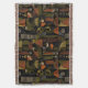 Sophisticated mid-century geometric pattern blanket featuring layered circles, arches, triangles, and rectangles in forest green, burnt orange, ochre, and cream on a black background. Rich textures and retro-modern shapes create a bold design ideal for Bauhaus lovers, vintage décor fans, and anyone drawn to moody modern style.