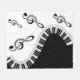 con fondo blanco y negro y teclas de piano con notas musicales también con teclas de piano.