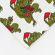 Un dibujo de un dibujo animado T-Rex que lleva un gorra de Papá Noel y que lleva a cabo dos presentes.
