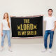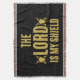 Esta manta de lanzamiento presenta un tipo de letra de letra en negrita de antonio con letras de colores dorados que muestran la frase bíblica "El Señor es mi Escudo" con un icono de espada y escudo a cada lado en este tema bíblico del dicho. Esta manta está hecha con 75% de algodón y 25% de poliéster con un toque muy suave de lavado de manos.