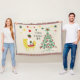 Un oso de peluche lindo y cariñoso, sentado en una silla, con su gorra Navidad y sosteniendo una caja de regalo. Se para junto a un árbol de Navidad decorado con adornos navideños y estrellas de colores. Estilo clásico vintage. Personalízalo con tu monograma.