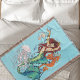 Sirena de cabello rojo con joyas de oro. La sirena tiene una cola verde azulada, verde y azul. Alrededor de la esmeralda hay un caballito de mar, conchas de pescado gelatina y botellas de agua todo en un fondo azul