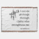 Esta manta de tiro muestra el versículo de la biblia de KJV "Philippians 4:13" en una audaz huella de lora con letras negras más citación de la biblia de la versión del Rey James con cubierta cruzada con una bufanda con cubierta de drapor en este tema de verso de la biblia. Esta manta está hecha con 75% de algodón y 25% de poliéster con un toque muy suave de lavado de manos.
