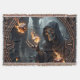 Flamas góticas, el guardián de los dados ardientes. La figura de la Parca Grim Reaper se alza en medio de un círculo de dados ardientes, reminiscentes de pequeñas fuentes de fuego y sugiriendo energías mágicas o apocalípticas. El fondo, oscuro y borroso, refuerza el ambiente místico y sombrío.