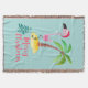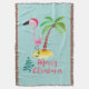 Tira una manta con un lindo ilustracion de un flamingo rosado en un sombrero de santa roja. Junto a una palmera verde sobre un montón de arena amarilla. Se coloca un diseño de flamante árbol de navidad junto al texto Feliz Navidad. Escrito en el color rosa en un lujoso tipo de letra manuscrita. Fondo verde pastel.
