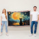 Animales graciosos y sensacionales, ciudad nocturna y cielo estrellado. El pequeño gato negro lindo está mirando al cielo estrellado inspirado en Vincent van Gogh. Un paisaje de fantasía colorido. Pintura digital de petróleo, arte fino.