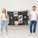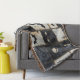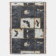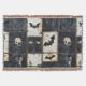 Una manta estampada de denim Halloween angustiada con murciélagos, cráneos y diseños de corazón oscuro sobre una rejilla negra y crema. Estética gótica, grunge y espeluznante, ideal para una decoración espeluznante, regalos alternativos y estilo de fiesta de Halloween.