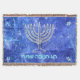 Un brillante oro Hanukkah menorah y "Chag Chanukkah Sameach" (Feliz Hanukkah) en un brillante texto azul y blanco superpuesto en una imagen fractal azul y blanco que recuerda a copos de nieve en una tormenta.