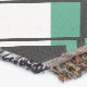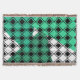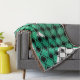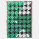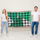 Esta manta de trébol tiene un diseño moderno de mediados de siglo de diamantes negros sólidos en el interior de los contornos de diamante negro con triángulos en tonos de verde marino bajo ellos, todo sobre un campo de blanco.