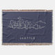 Características del este diseño un bosquejo dibujado mano del horizonte de Seattle en un fondo azul marino.