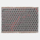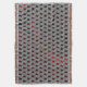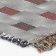 Curvas rojas imagen bajo rectángulos cuyos colores van del gris al más ligero o más oscuro, dando una percepción de relieve y profundidad dependiendo de la posición a ver o la percepción personal. Las formas rectangulares son como si fueran piezas incrustadas. Los rectángulos de la impresión dan cierta apariencia de que son placas grises pegadas.