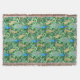 Patrón Art Nouveau basado en un tejido inspirado en el tapiz de William Morris vintage que representa una escena forestal con pavos reales, arcos y zorros, digitalmente representada en azul cobalto, turquesa y neutrales sobre un fondo verde de bosque oscuro para el aspecto de un tapiz tradicional