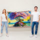 Una hermosa pintura digital de una exuberante isla verde en medio del océano. La isla está cubierta de árboles frondosos y flores, y el agua es azul claro. Un pequeño barco está anclado en la bahía y algunos se relajan en la playa. Este cuadro es perfecto para quien quiera escapar a un paraíso tropical.