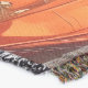 Sie trägt ein reich dekoriertes Gewand aus tiefem Schwarz, warmem Orange und sattem Bordeauxrot, veredelt mit kunstvollen goldenen Stickereien. Die Texturen und Muster vermitteln Luxus, Handwerkskunst und kulturelle Symbolik. Hinter ihr befindet sich ein lebendiges geometrisches Mosaik aus roten, blauen, goldenen und schwarzen Kacheln, die in harmonischer Symmetrie angeordnet sind. Dieser Hintergrund verstärkt die historische Atmosphäre und verbindet sie gleichzeitig mit moderner digitaler Kunst.