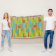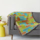 Esta manta de tiro tiene un diseño moderno de mediados de siglo de repetición de rectángulos en verde lima, marrón canela y turquesa con círculos en la parte superior.