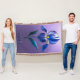Die leuchtend blauen Blütenblätter mit metallischem Glanz kontrastieren mit dem intensiven gelben Zentrum. Vor einem satten violetten Hintergrund entsteht ein Gefühl von Tiefe und Raffinesse.