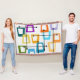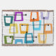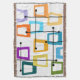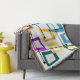 Esta manta de tiro tiene un diseño de rectángulos que se estiran en un extremo en colores gruesos, naranja, verde, verde azulado, morado, azul, rosa y amarillo con líneas atómicas que los atraviesan.