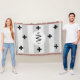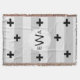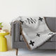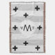 La moderna manta monocromática de estilo escandinavo con rayas grises y blancas y con signos más negros. El centro presenta letras monográficas personalizadas en negro grueso en negrita.