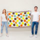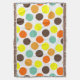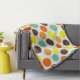 Esta manta de tiro tiene un diseño geométrico de puntos azules, naranjas, amarillos y marrones.
