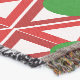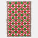 Esta manta de lanzamiento tiene un diseño geométrico de triángulos rojos y profundos que se repiten con círculos verdes sobre un campo de blanco roto. ¿Quieres el mismo diseño en colores diferentes? Mándame un mensaje.