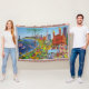 The painting features New York’s great landmarks: the Statue of Liberty, the Chrysler Building, the Empire State Building, perhaps the Guggenheim Museum, major skyscrapers, and other well-known structures.
