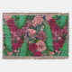 Patrón dibujado a mano con pavos reales y varios rosas sobre un fondo oscuro
