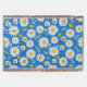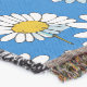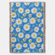 Patrón vibrante y alegre de margaritas sobre un fondo azul brillante. Las margaritas son principalmente blancas, con centros amarillos audaces, y están dispuestas de manera dispersa pero equilibrada. Además de las flores, hay varias hojas verdes y tallos delicados intercalados en todo el diseño, lo que añade un toque de naturaleza y frescura. La composición general crea un ambiente animado y veraniego, lo que la hace visualmente atractiva e invitante.