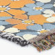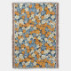 Un patrón floral vibrante cubre toda la imagen. Las flores, pequeñas y estilizadas, en tonos naranja, azul claro y blanco roto, están densamente dispuestas sobre un fondo azul marino. Las flores tienen un aspecto ligeramente imperfecto, de aspecto pintoresco, con variaciones en la saturación de color y en la forma que le dan al patrón un aspecto texturado, casi pintado a mano. El patrón repetido crea un efecto visual alegre y ocupado.