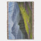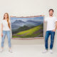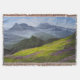 Un exuberante y verde prado lleno de vibrantes flores silvestres violetas se extiende por todo el frente bajo un cielo azul brillante. Montañas macizas se elevan majestuosamente en el fondo, creando un paisaje sereno y tranquilo.