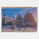 Atardecer cubierto de nieve en la plaza del ayuntamiento de Riga en invierno en Riga, Letonia. Vista de la famosa Casa de las Cabezas Negra y la Estatua de Roland contra el cielo azul con luces de puesta de sol