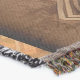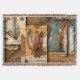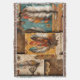 Diseño tribal azteca nativa de acuarela norteamericana de patrón plumas bloqueadas y formas geométricas en arena marrón, naranja, adobe y azul.
