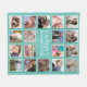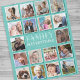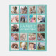 Manta personalizada de imagen con un fondo verde azulado de moda que se puede cambiar a cualquier color, marcos de foto collage de 18 cuadrados, la cita "la familia lo es todo", tu apellido y el año establecido.