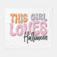Este diseño lúdico y colorido presenta la frase "A este Chica le encanta Halloween" en negrita, con letras de estilo retro. El texto se divide en tres líneas, cada una de las cuales tiene una paleta de colores distinta. La palabra "ESTO" está en un naranja suave y texturizado, "CHICA" en un color púrpura pastel y "AMANTES" en un rosa claro y bubblegum. La palabra "Halloween" se escribe en una cursiva suave y negra, agregando contraste y equilibrio al diseño. Cada letra tiene una forma ligeramente redondeada y burbujeante, lo que le da al diseño un toque divertido y caprichoso, perfecto para celebrar el espíritu festivo y alegre de Halloween.