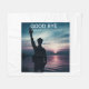 Esta imagen representa la silueta de un hombre parado en aguas poco profundas con el brazo levantado hacia el cielo. El fondo muestra una puesta de sol serena, con un horizonte que mezcla tonos rosas, naranjas y azul profundo. El agua es tranquila y refleja los colores del cielo, creando un ambiente tranquilo y de ensueño.