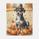 Una pintura acuarela de un perro alegre sentado en medio de un montón de hojas caídas vibrantes, rodeado de pequeñas calabazas y bellotas dispersas. El perro lleva un pequeño gorra peregrino y vigas de alegría, capturando el espíritu del Día de Acción de Gracias. Como telón de fondo, los campos de suave cosecha y los árboles de tonos dorados crean un ambiente campestre tranquilo. Las texturas suaves y los tonos cálidos y mudos del otoño le dan al lugar un ambiente acogedor y nostálgico, perfecto para celebrar la belleza de la temporada.