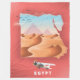 Ilustracion impreso de afiches de viajes en Egipto que muestra el desierto y una pirámide a lo lejos.