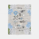 Tantas divertidas y extravagantes imágenes antiguas del libro Alice in Wonderland: la chica Alicia, Conejo Blanco, Gato Cheshire, tetera vintage, taza, reloj de bolsillo y llaves, y la cita, Curiouser y curiouser gritaron Alicia, junto con mariposas, sobre un fondo blanco de madera lavada enmarcado por hermosas hortensias azules y blancas, hacen de esta gran manta de eslora azul y negra con temática literaria blanca.