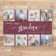 Dale a la abuela un regalo que ella apreciará. Esta manta de collage de fotos muestra ocho de sus fotos cuadradas favoritas de los nietos, junto con el mensaje "Te amo abuela". La palabra "abuela" aparece en un elegante guión de escritura a mano en blanco con flores al principio y al final sobre un fondo rojo borgoñoso. Añade los nombres de hasta cuatro nietos. Un regalo ideal para vacaciones, cumpleaños o día de abuelos.