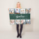 Dale a la abuela un regalo que ella apreciará. Esta manta de collage de fotos muestra ocho de sus fotos cuadradas favoritas de los nietos, junto con el mensaje "Te amo abuela". La palabra "abuela" aparece en un elegante guión de escritura a mano en blanco con florecientes al principio y al final en un fondo verde esmeralda. Añade los nombres de hasta cuatro nietos. Un regalo ideal para vacaciones, cumpleaños o día de abuelos.