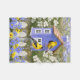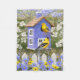 Un par de ataúdes americanos se posan en un bonito pajar púrpura en un hermoso jardín primaveral lleno de margaritas azules y amarillas en una valla blanca de piquete. Al fondo, un hermoso jacarandá cubierto de flores violetas, rodeado de madera de dogma florida. Obra de arte original creada por la artista de vida silvestre Crista S. Forest.