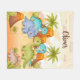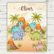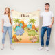 Esta manta personalizada presenta cuatro adorables dinosaurios bebé de dibujos animados reunidos en un paisaje prehistórico con volcanes y palmeras, con colores suaves y vibrantes.